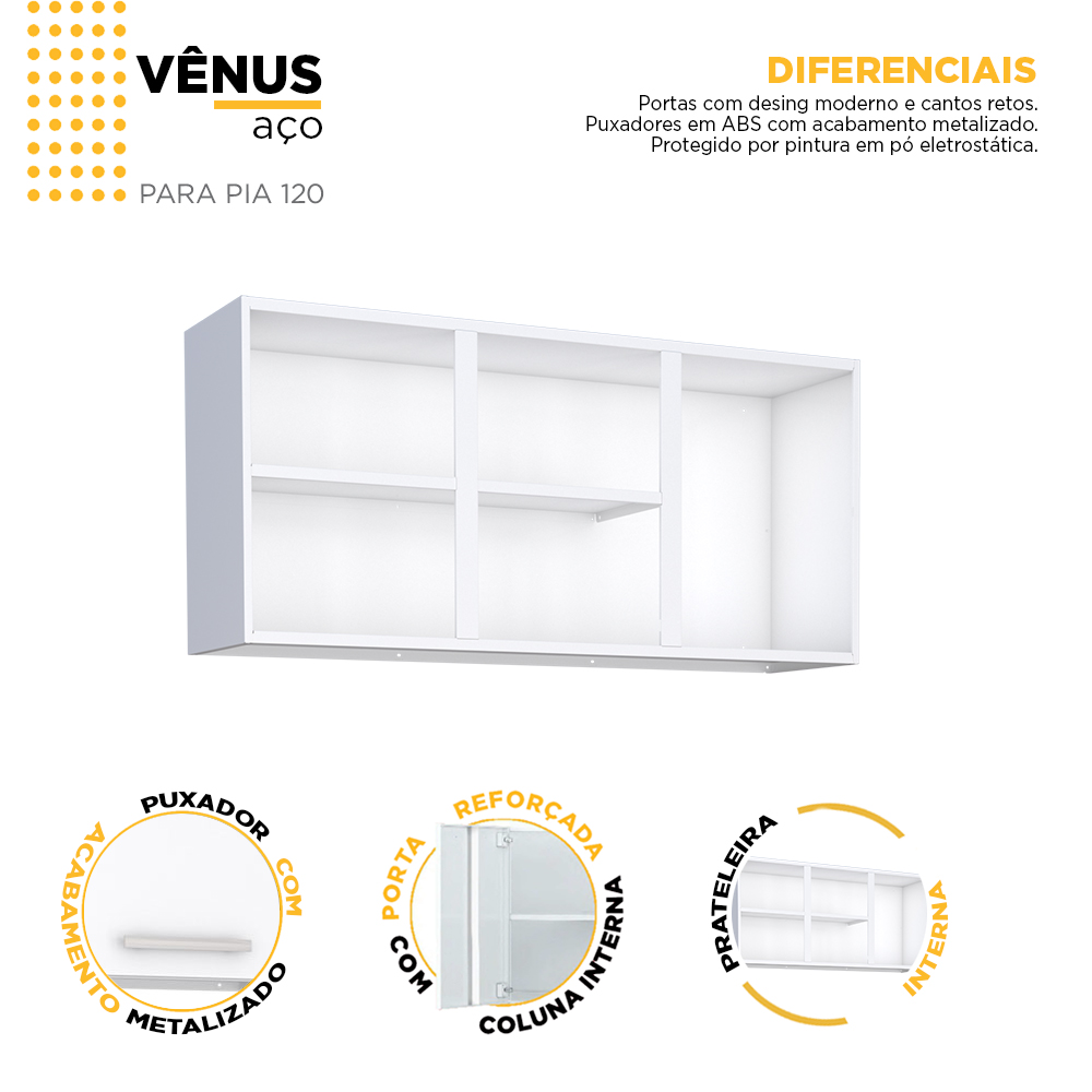 A linha de armários em aço para cozinha Vênus Flat, da Cozimax, é resistente, fabricado em aço eletrogalvanizado com garantia de 5 anos, protegido por pintura em pó eletrostática, possui portas com design moderno e cantos retos, puxadores em ABS com acabamento metalizado.