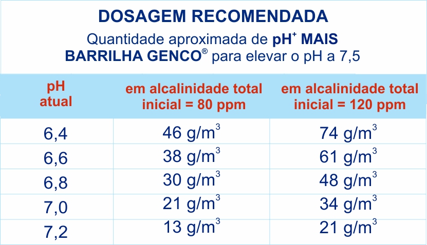 1) A quantidade de pH® MAIS BARRILHA GENCO® a ser utilizada depende de vários fatores além do pH. Baseie-se nas quantidades indicadas na tabela abaixo: FOTO AO LADO SISTEMA